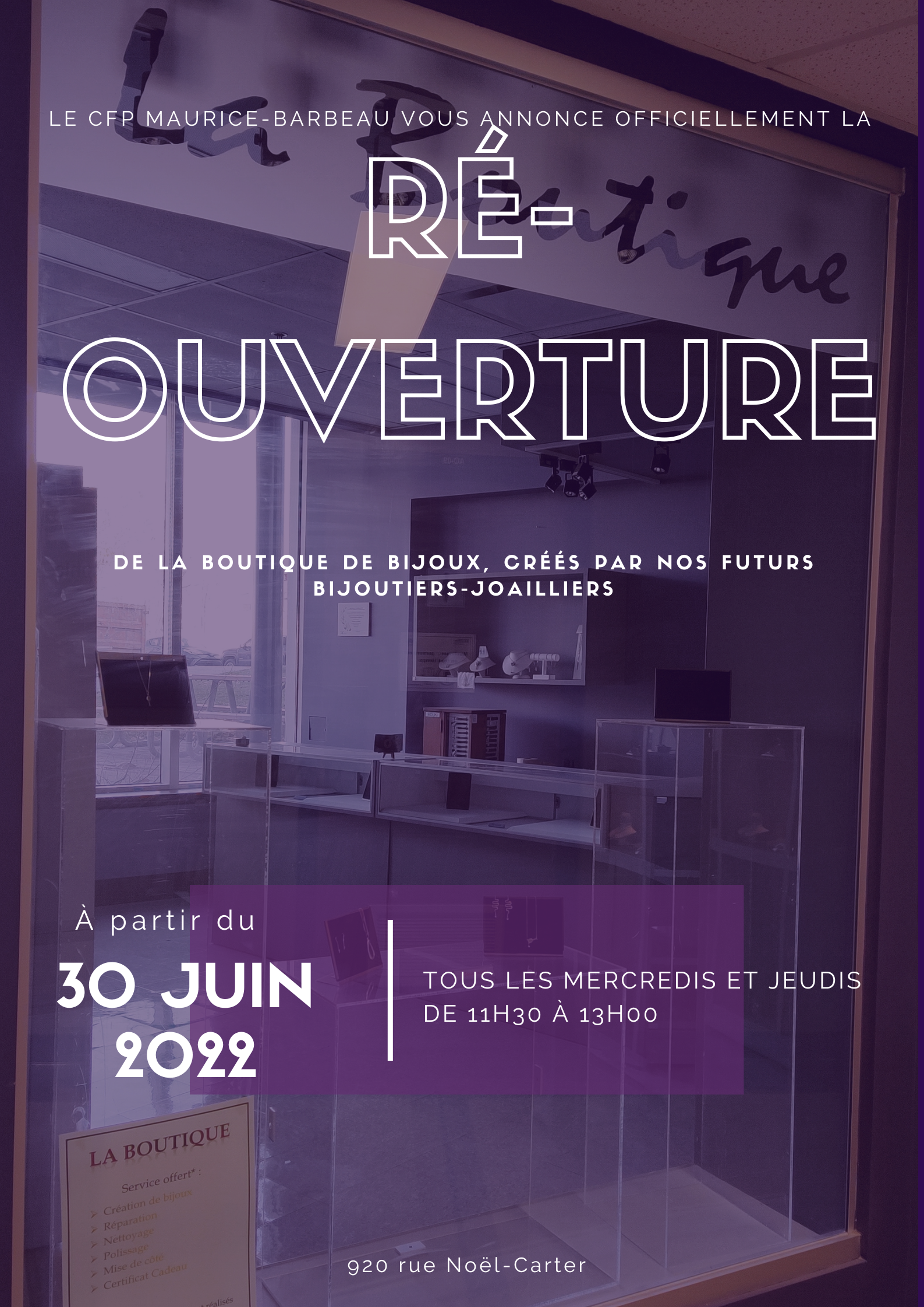 Venez admirer les créations, faire des achats, ou encore des demandes de nettoyage ou de réparation de bijoux*! La Boutique, entièrement gérée par les élèves, est ouverte les mercredis et jeudis de 11h30 à 13h00. Celle-ci est située à l’entrée du Centre, près de la cafétéria.